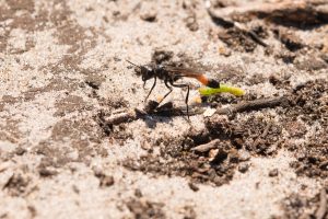 My colleagues and I spent two months handling the Heath Sand Wasp, and none of us were ever stung. Yet harmless as they are to humans, these wasps are a caterpillar’s bane! Both the Heath Sand Wasp and Red Banded Sand Wasp incubate their eggs a few centimetres underground, each in a specially dug burrow that can take up to an hour to complete. While the two pairs of hind limbs open wide on the sides of their bodies, almost crossing them with a big ‘X’, the two front legs are shorter and point forward. This allows the wasp to balance herself, for only females dig burrows, using the two hind pairs, and use their shorter front legs as shovels to move sand out of the way. And if they have a rocky start, they can either use their mandibles to remove the obstacle or, if the stone is too big, abandon the dig altogether and look for a more favourable spot.