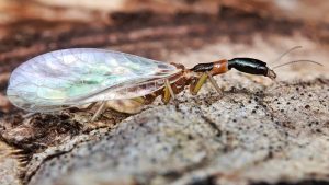 Another evolutionarily significant insect, the snakefly Xanthostigma xanthostigma, impresses with its look and life span in controlled conditions – 77 days. Despite many insects being short-lived, this one consumed aphids daily throughout the experiment. This observation prompts more detailed studies on its ecological significance and predation efficiency. Furthermore, its larvae can only survive in the presence of a nourishing habitat, e.g. under tree bark where larvae find other small insects to prey on. Moreover, encountering such a fabulous insect is an indication of an ecologically noteworthy and sustainable habitat mosaic that offers home to rare insects with sophisticated larval stages. The photograph below shows a very rare sighting – a freshly emerged imago resting on the bark of a Crack Willow tree. Such valuable moments will remain inconspicuous, if not purposefully sought and documented in detail. This is why macro photography in the field can be said to be an exciting and intricate form of wildlife photojournalism.