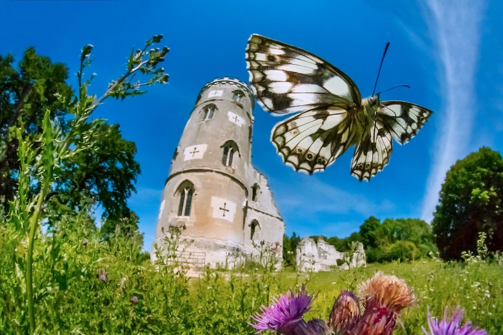 For me, the most fascinating thing about insects is that they fly. And although butterflies for example are prized for the form and ornamentation of their wings, we need to remind ourselves that wings are there to do things. Many years ago, I conceived of a new kind of close-up image which would replicate the world of a flying insect, as it might be experienced by another insect sitting or flying alongside. This second insect would in fact be a proxy for a human being, magically reduced in size to an inch-high Tom Thumb. Tom Thumb would see the insects, not only in extreme close-up, but also at the same time as occupants of a landscape: the same landscape that we ourselves see with its rich tapestry of fields, hills, rivers and sky. This would be a radical departure from the conventional depiction of insects as isolated objects at the end of a macro-lens.